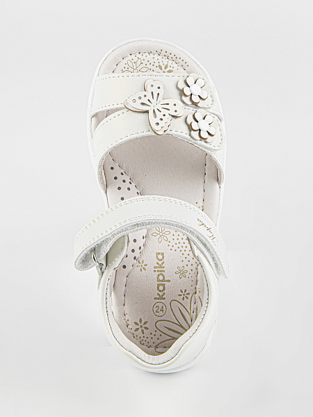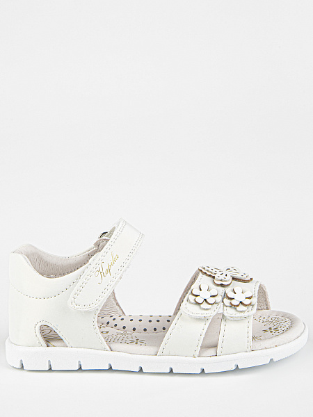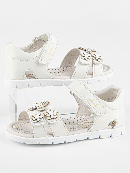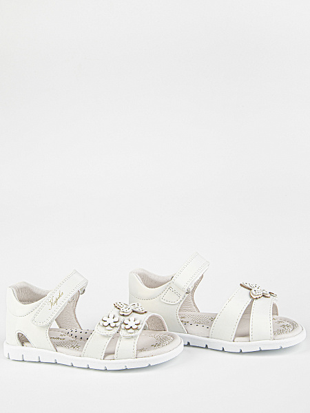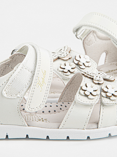 Нежный белый цвет и цветочный декор делают эти сандалии настоящим украшением летнего гардероба. Открытый носок дарит свежесть, высокая закрытая пятка надёжно фиксирует стопу.